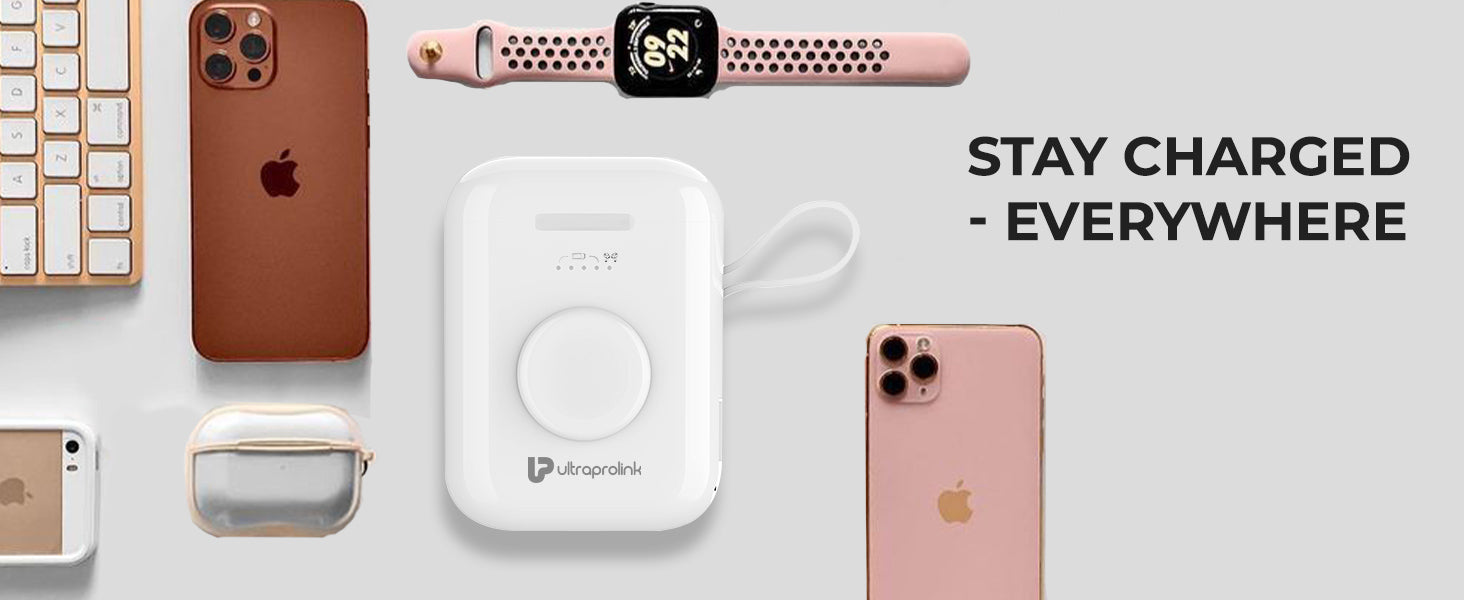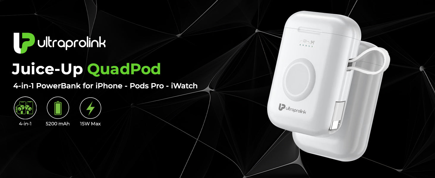 The UltraProlink Juice-Up QuadPod is a versatile 4-in-1 power bank designed to charge multiple devices, including the AirPods Pro Gen 1&2, iPhone, and iWatch. With a built-in AirPods Pro charging case, it's compatible with AirPods Pro Gen 1 & AirPods Pro 2nd generation, making it a perfect replacement charging case for on-the-go use.